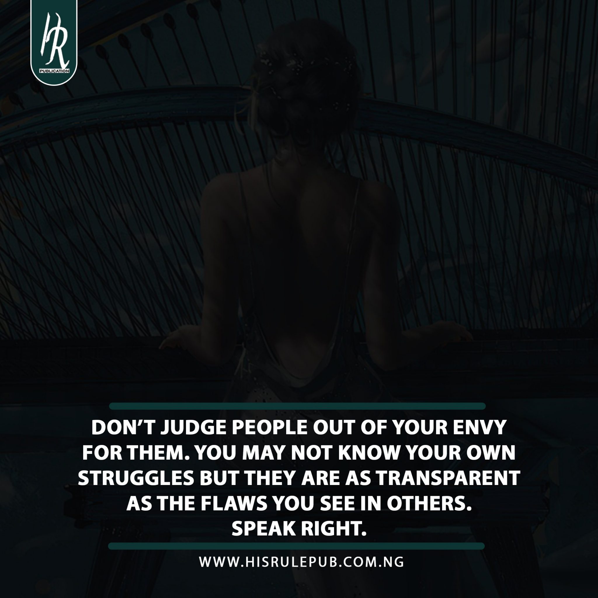 Don’t judge people out of your envy for them. You may not know your own struggles but they are transparent as the flaws you see in others. Speak right. DontJudge…
